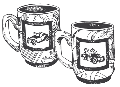 Две (или более) одинаковые бочкообразные чашки, ткань средней плотности с рисунком на автомобильную тематику (принты с машинными дисками, номерами, деталями и т. д.), ткань с изображением ретро-автомобилей (каждый автомобиль не более 5 см в высоту) или специально распечатанные на ткани изображения автомобилей, брадсы и металлические подвески на автомобильную тематику, тесьма бежевого или белого цвета шириной 5 мм, нитки в тон фону ткани, нитки контрастного цвета для временных швов, бумага, маркировочные инструменты, игла, булавки, сантиметровая лента, линейка, ножницы, швейная машина.