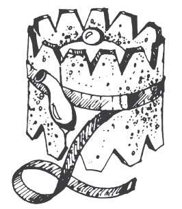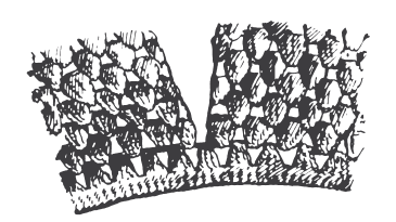 1 воздушная петля подъема, 1 столбик без накида в такой же столбик 1-го ряда;* провязывайте выпуклые столбики с накидом вокруг правого, т. е. первого в ряду, столбика с накидом (одна ножка «рогатки») из группы, образующей «рогатку» в первом ряду. Выпуклые столбики провязываются перед работой, всего провяжите снизу вверх 6 рельефных столбиков вокруг одного столбика с накидом из нижнего ряда. Выполнив обвязку одной ножки «рогатки», провяжите 1 воздушную петлю, поверните работу так, чтобы основание (острие) «рогатки» смотрело вправо, и провяжите 1 столбик без накида в вывязанный ранее 1 столбик без накида этого же ряда.