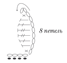 – 1 воздушная петля подъема + 1 столбик без накида в 1-й столбик без накида нижнего ряда + 2 воздушные петли;
