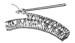 5. Далее вывязывайте 6 выпуклых столбиков с накидом вокруг второго столбика с накидом, т. е. вокруг второй ножки «рогатки» нижнего ряда. После этого повторяйте рисунок от * до конца ряда. Всего должно получиться 6 «ракушек», заканчивайте ряд, провязав 1 столбик без накида в 3-ю петлю из 5-ти начальных воздушных петель подъема 1-го ряда. Поверните работу для вывязывания 3-го ряда.