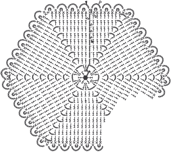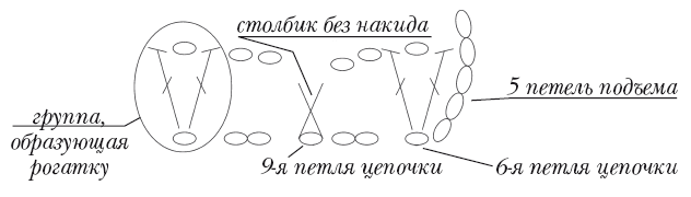 + 1 столбик с накидом в следующий промежуток «рогатки» + две воздушные петли + 1 столбик без накида в столбик без накида нижнего ряда, снова 2 воздушные петли;