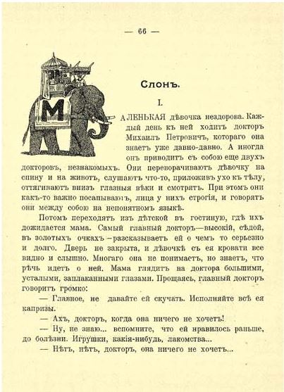 Как в рассказах, а не в жизни… И ещё маленькое произведение – из лучших с концом, «как в рассказе», – «Слон». Тяжело заболевшая девочка просит привести к её кроватке живого слона – и жизнь идёт навстречу ребёнку, удовлетворяя право детства.