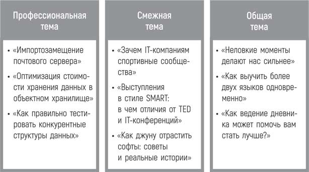 Например, про возможности для саморазвития в IT-сфере или важность публичных выступлений для тимлида.
