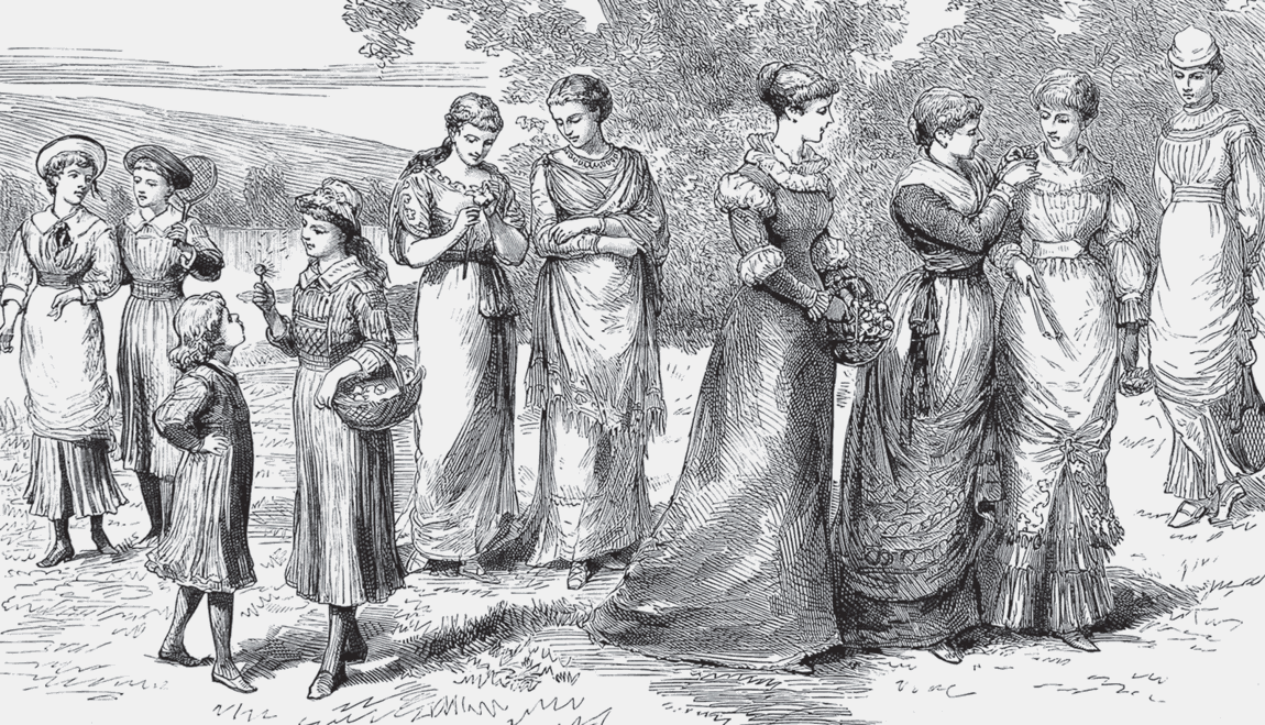 Западная история знала множество горячих споров о фасонах женской одежды. В некоторые периоды, например в Европе после Великой французской революции, популярностью пользовались свободные греческие драпировки; так в 1790-х годах появились чудесные белые платья из хлопка. В другие же периоды истории, например в Англии 1720-х годов, нижние юбки были жесткими, их было очень много, и порой казалось невероятным, что под таким обилием ткани скрывается женщина.