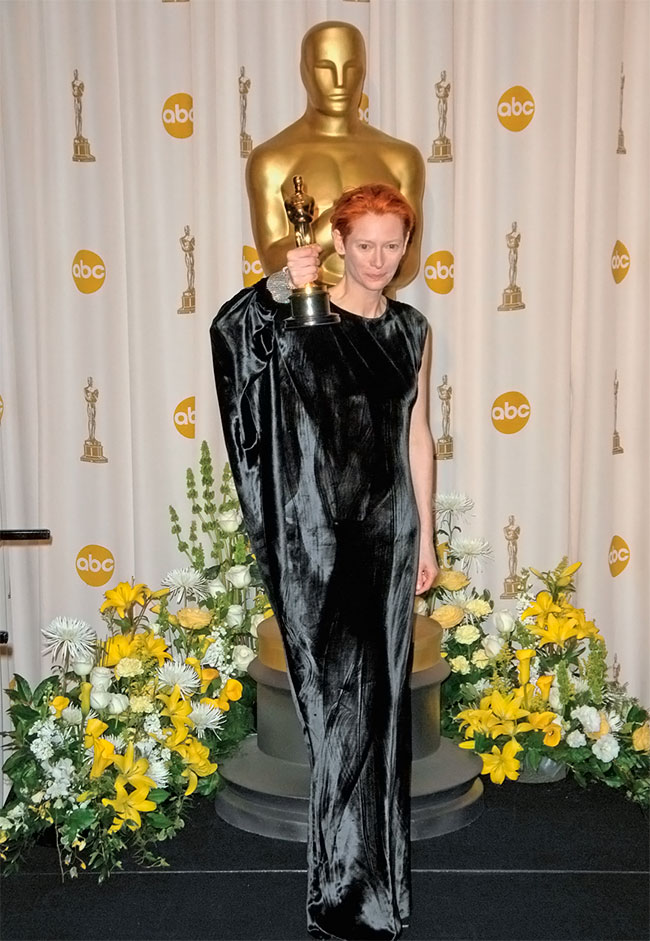 В 2008 году на вручении «Оскара» Тильда Суинтон появилась в напоминающем тогу летящем черном атласном платье из шелка-сырца от «Ланвен» (Lanvin). Некоторые обозреватели назвали наряд мусорным мешком. Я же подумал, что платье было великолепным – на ней. Своим нарядом она как бы говорила, что принадлежит богеме, а не Голливуду, и смелость Тильды Суинтон окупилась сполна, когда ей вручили «Оскар» за лучшую женскую роль второго плана в фильме «Майкл Клейтон».