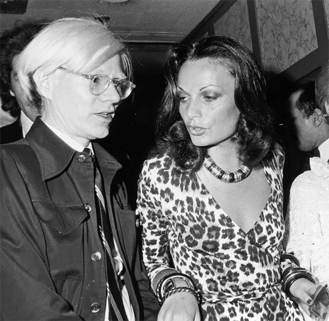 Диана фон Фюрстенберг в одном из своих фирменных платьев с Энди Уорхолом, 1974 год.