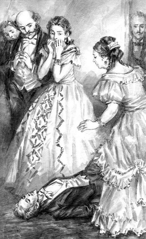 Он давно уже стоял говоря. Старичок уже испуганно смотрел на него. Лизавета Прокофьевна вскрикнула: «Ах, боже мой!», прежде всех догадавшись, и всплеснула руками. Аглая быстро подбежала к нему, успела принять его в свои руки и с ужасом, с искаженным болью лицом услышала дикий крик «духа, сотрясшего и повергшего» несчастного. Больной лежал на ковре. Кто-то успел поскорее подложить ему под голову подушку.