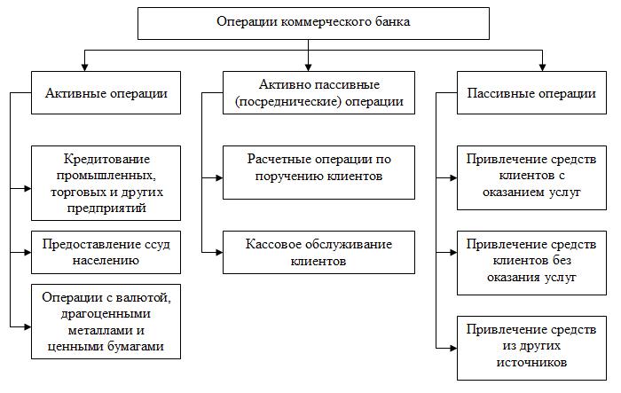 Операции коммерческих банков делятся на три группы: пассивные, активные и комиссионно-посреднические (осуществляются по поручению клиента на комиссионных началах: инкассовые, расчетные, факторинговое обслуживание, и др.).