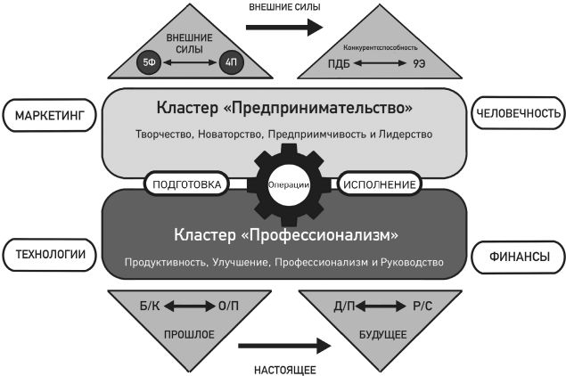 Эти кластеры окружены другими функциями и взаимодействуют с ними. На них влияют внешние силы (см. левый верхний угол рисунка 1.1), представленные пятью факторами (5Ф): технологическим, правовым (включая нормативные акты), экономическим, социокультурным и рыночным. Все это – перемены, которые затрагивают ключевые элементы модели – противника, потребителей и само предприятие (4П).