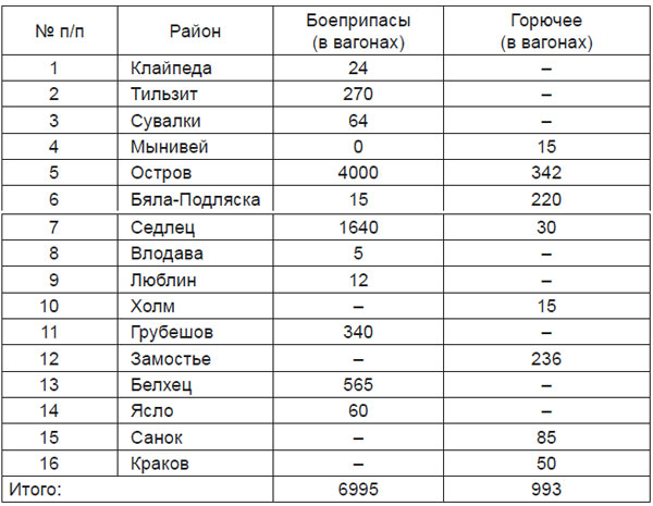 Районами сосредоточения огнеприпасов и горючего являются: Клайпеда (Гомель), Сувалки, Седлец, Остров, Ярослав и Белжец.