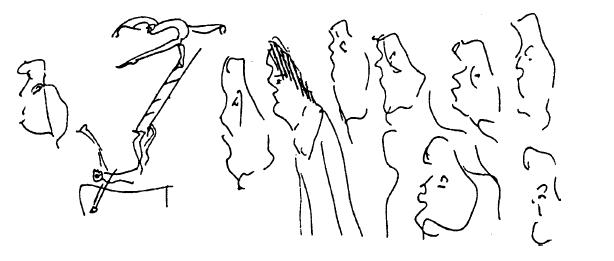 7 ноября. Доклад Виглера о Геббеле. Сидит на сцене с декорациями современной комнаты, словно из какой‑нибудь двери выскочит его возлюбленная, чтобы начать наконец пьесу. Нет, он делает доклад. Голодание Геббеля. Сложное отношение к Элизе Ленсинг. В школе у него учительницей старая дева, она курит, сморкается, бьет, а послушных одаривает изюмом. Он всюду ездит (Гейдельберг, Мюнхен, Париж) без определенной цели. Сперва он служка у церковного смотрителя, спит под лестницей в одной кровати с кучером.