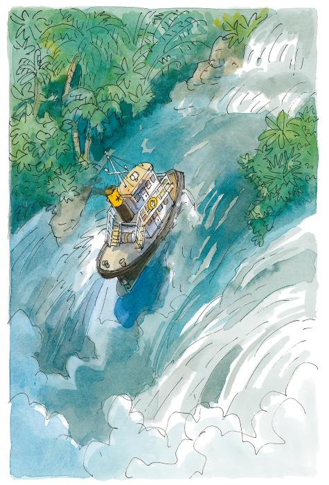 Но в ту самую секунду, когда «Упрямый» должен был ударить «Железную звезду», – КАТАКРАК! – корабль похитителей шустрым лососем взметнулся в воздух и взлетел на вершину водопада, будто невидимая гигантская рука перенесла его туда.