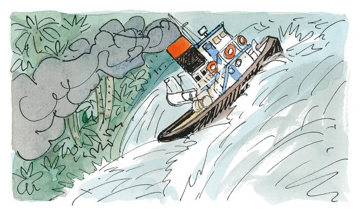 – Этот Катакрак приносит нам одни несчастья, начальник, – заметил Борис Димедрол. – Помните, когда мы разбили витрину, началась гроза. Потом пришлось разворачиваться, потому что дорогу перекрыла речная полиция. Потом этот прыжок на водопад. А теперь корабль вообще делает, что ему в голову взбредёт! Ненормально всё это. Бросить бы эту штуковину за борт.