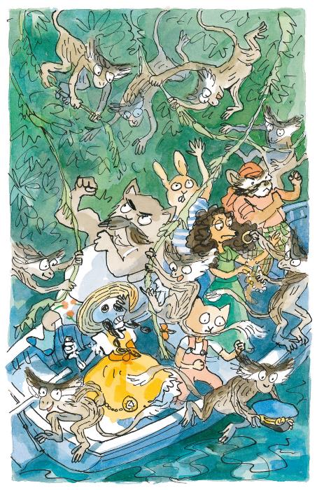 Внезапно на лодку обрушились целые грозди крошечных обезьянок. Они схватили китель Бонифация, вырвали у него часы. И что всего ужаснее – похитили фуражку! Несколько обезьянок ощупывали одежду Бульона и Спиди, другие вцепились в украшения, которые дрожащими руками протягивала им Ева Боливар. Однако, увидев Анастасию, игрунки бросились врассыпную, визжа от страха.