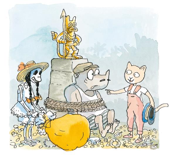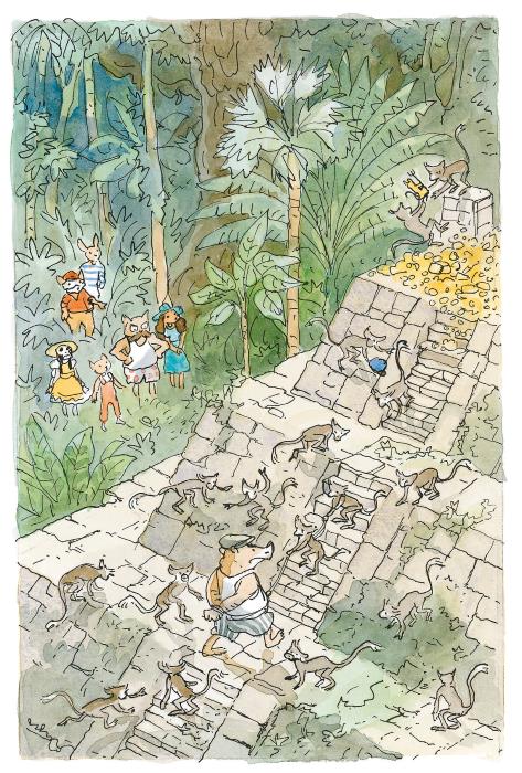 Через час они вышли к высокой полуразрушенной пирамиде. По ней там и сям скакали хихи-игрунки. Несколько обезьянок карабкались на вершину, таща за собой на верёвке Гедеона Недоброго. Другие несли наверх статую Катакрака, бога грома и молний, чтобы усадить его на трон, установленный в центре огромной блестящей кучи.