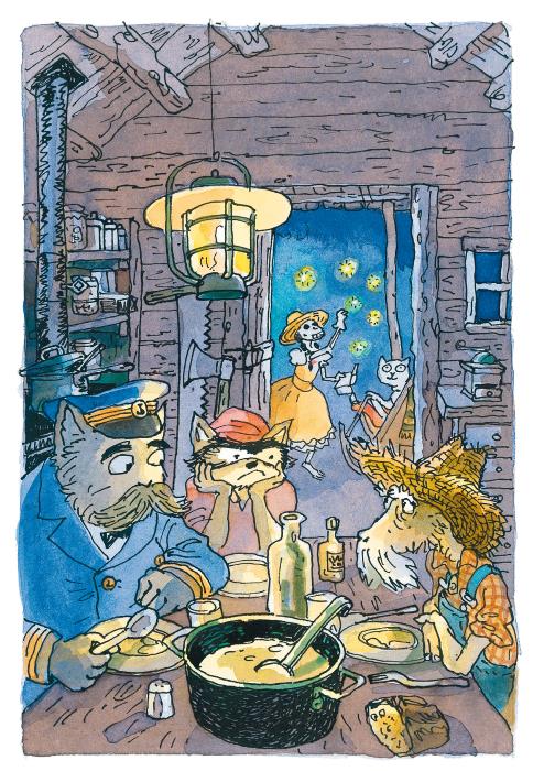В доме старичка Луиса капитан и повар «Упрямого» уселись за стол, на котором дымилось рагу из речных ужей. Снаружи, на веранде, Анастасия ловила светлячков в маленькую жестяную коробочку, а Лу вовсю раскачивалась в кресле-качалке.