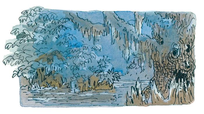 Через две недели буксир вошёл в воды неподвижной заболоченной реки в штате Луизиана. Приближалась ночь, и из леса доносились какие-то зловещие крики. Аристид дрожал как осиновый лист. Спиди был на грани нервного срыва и с беспокойством поглядывал на длинные тени, окружившие корабль.