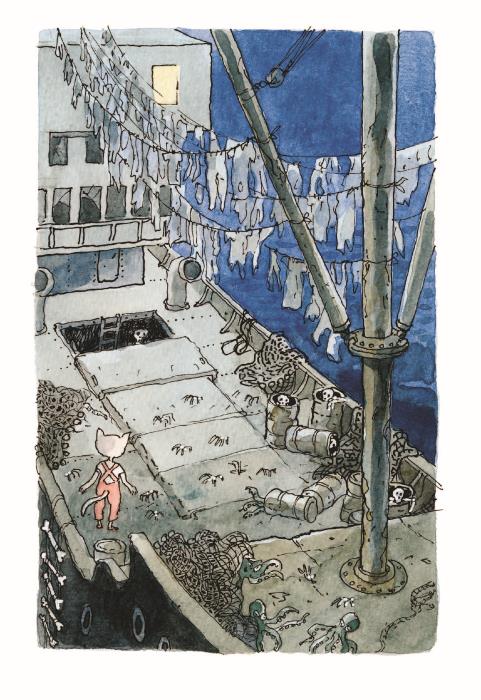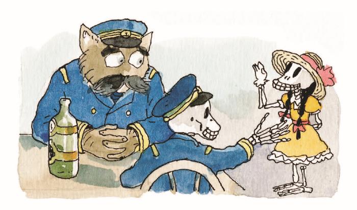Вдруг он почувствовал, что Анастасия тянет его за рукав своей маленькой костяной ручкой. Она всё тянула и тянула, и капитан Всехнаверх вынужден был пойти за ней на капитанский мостик «Бельфегора». Оттуда он увидел, что на борт корабля-призрака проникли пираты.
