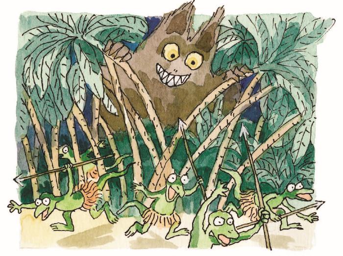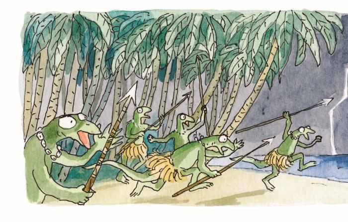 – Ах да, грохот. Представляете, «Бельфегор» зацепился днищем за камень, лежавший недалеко от незнакомого острова. Пробоины, к счастью, не было, но мы застряли. Пришлось бросать якорь, спускать на воду шлюпку и приставать к острову. А там – дикари! Высыпали на берег, вопят во всё горло. Трюмсель-брамсель! Нас так просто не возьмёшь! «Мы постоим за себя», – подумал я! Но оказалось, аборигены вовсе не собираются нападать. А сами спасаются! Да! За ними что-то гналось! Неслось на огромной скорости, аж пальмы ломались! Страшное волосатое чудовище – вот что это было! Ха-ха, до сих пор смешно, как вспомню!