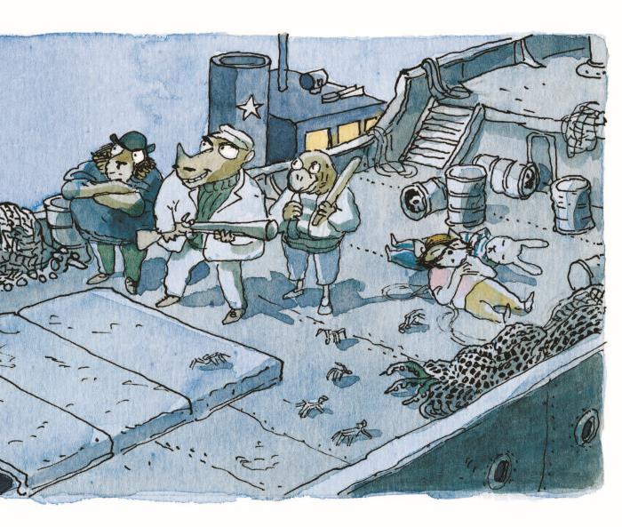 Прямо над Лу, на палубе корабля, Бульон и Спиди с каждым новым раскатом хохота делали шаг назад. Они не заметили, как на борт поднялись пираты с «Железной звезды». Злодеи подкрались к ним и оглушили, ударив по голове. Тем временем в рулевой рубке продолжалась беседа.