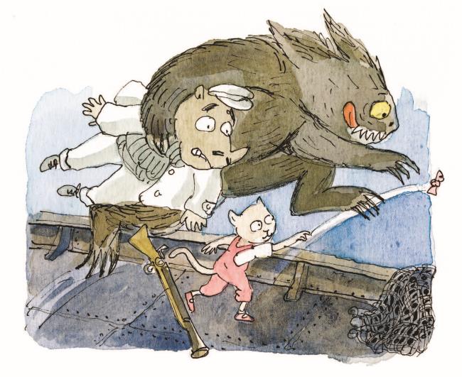 Чудовище не раздумывая перелетело с одного корабля на другой в погоне за драгоценной конфетой. Само того не замечая, оно увлекло за собой и Гедеона, которого продолжало держать за шиворот. Главарь морских разбойников от страха выронил свой антикварный мушкетон!