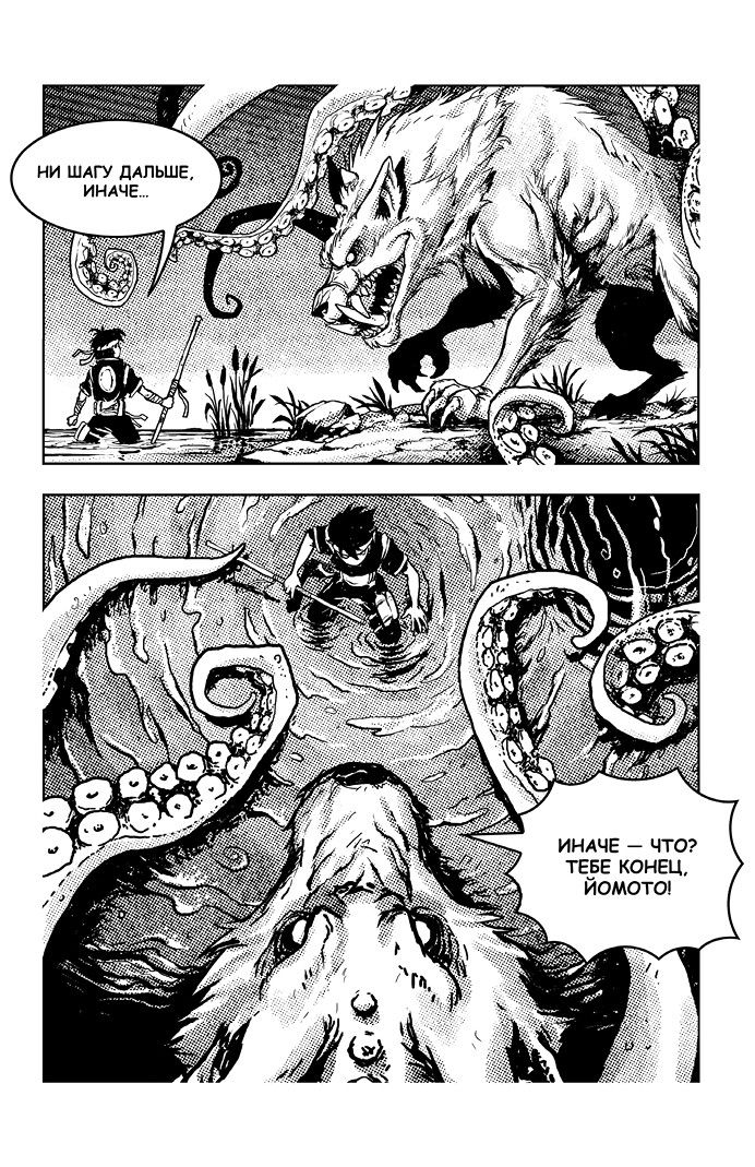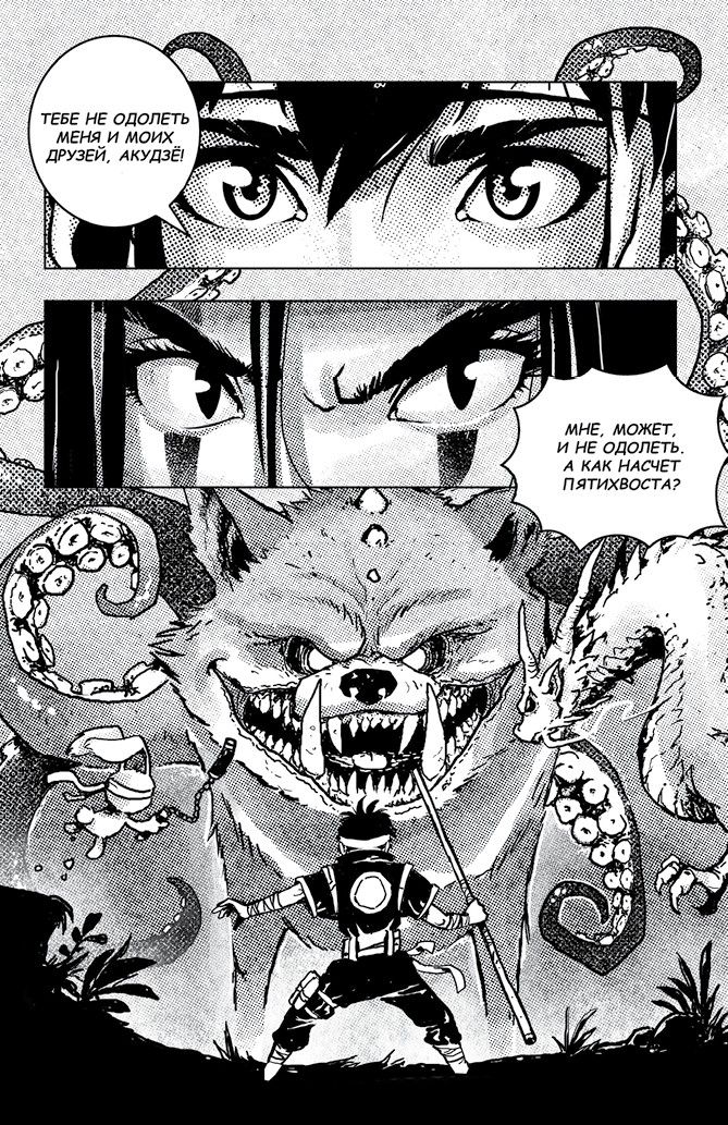 Пятихвост – просто ужас какой кошмарный! Ещё минуту назад я бы сказал, что Йомото вместе с друзьями – драконом Раку и боевым кроликом Усаги – без труда победят злую ведьму Акудзё. Однако теперь я в этом не уверен. Ведь Пятихвост огромный, как целый дом! Или даже больше! Похоже, Йомото видит всё примерно так же, потому что оборачивается к Усаги и Раку и кричит: