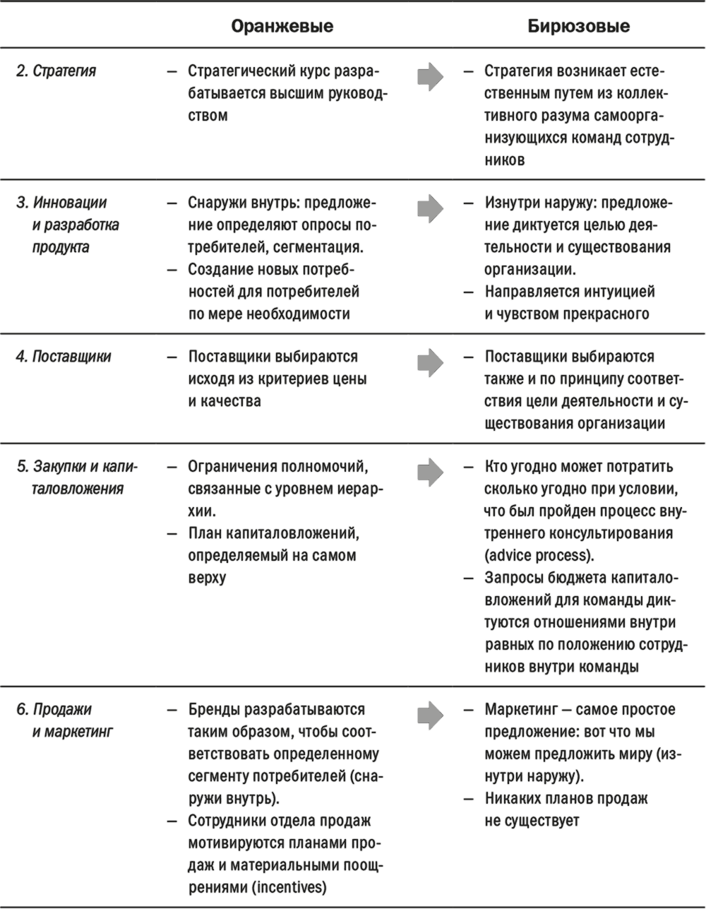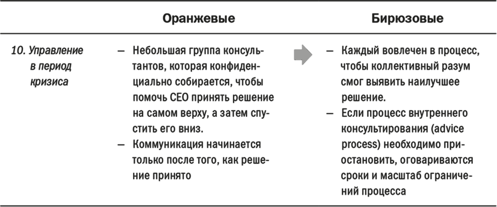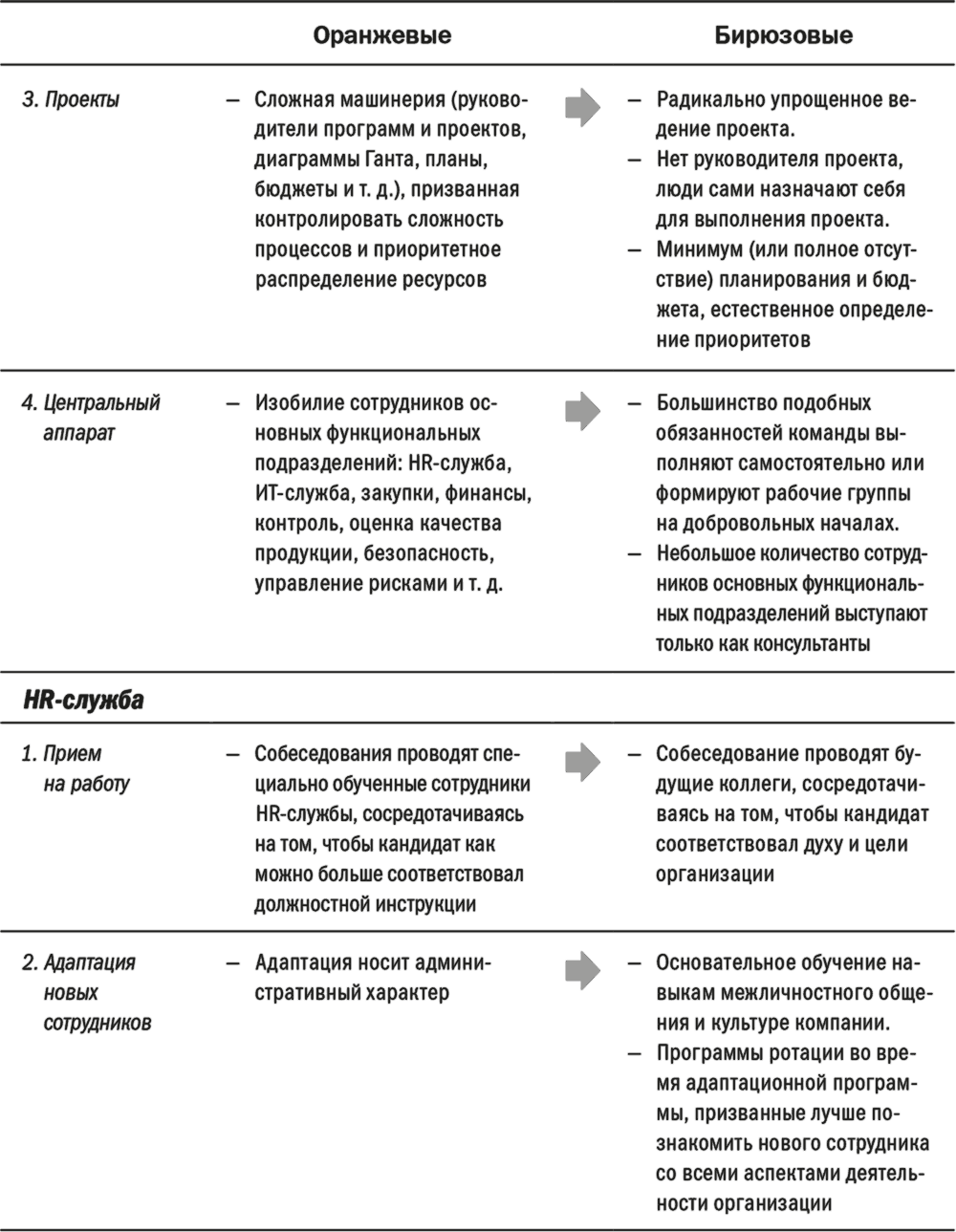 В таблицах ниже сравниваются структуры, практики и процессы Бирюзовых организаций и Оранжевых организаций (господствующая на сегодня форма управленческого мышления).