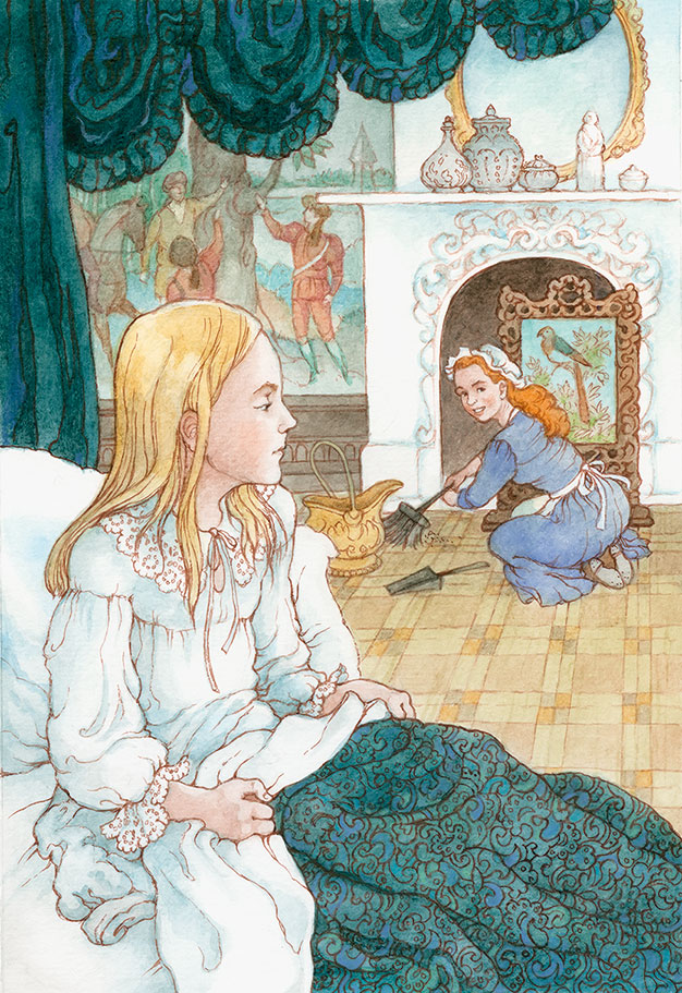 – А теперь пора тебе вставать, – сказала она. – Миссис Медлок сказала, чтобы я приносила в соседнюю комнату твой завтрак, обед и ужин. Там тебе устроили детскую. Я тебе помогу одеться, если ты встанешь. Если пуговицы у тебя на платье сзади, то ты их не можешь сама застегнуть.
