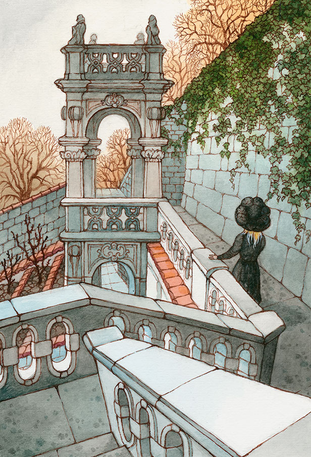 Когда она прошла через калитку, то очутилась в большом саду с широкими лужайками и извилистыми дорожками с подчищенными краями. Там были деревья, клумбы, хвойные деревья, подстриженные в разных причудливых формах, и большой пруд со старым серым фонтаном посредине. Но клумбы были обнажены, а фонтан не бил. Это не был запертый сад. Как можно запереть сад? Ведь в сад всегда можно войти…