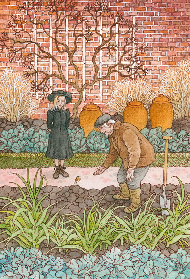 В следующую минуту произошло нечто удивительное. Она услышала мягкий шелест крыльев в воздухе – это летела к ним птичка с красной грудью. Она уселась на большой глыбе земли, очень близко к ноге садовника.