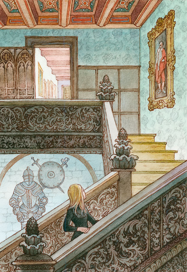 Она отворила дверь, вышла в коридор и пустилась бродить. Это был длинный коридор, из которого шли еще другие; ей пришлось подняться на несколько ступеней, потом еще на несколько. Повсюду были двери, двери, а на стенах висели картины. Иногда на них были изображены странные темные ландшафты, но по большей части это были портреты мужчин и дам в странных пышных костюмах из атласа и бархата.