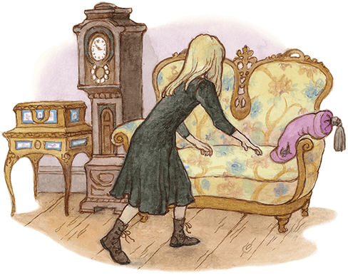 После того как девочка затворила дверцу шкафчика, она услышала какой-то легкий шорох. Она вскочила и стала осматривать стоявший у камина диван, откуда этот шорох слышался. В углу дивана лежала бархатная подушка, в которой была дыра, а из этой дыры выглядывала крохотная головка с парой испуганных глаз.