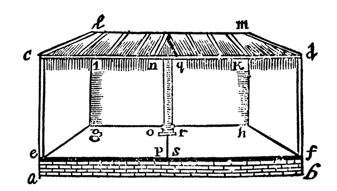 [Закрыть], в которой описана система памяти, образованная рядами одинаковых «театров». Уиллис дает иллюстрацию одного из таких «театров», или, как он их еще называет, «хранилищ» (рис. 10). Это одноэтажное строение, в котором отсутствует передняя стена, так что можно заглянуть внутрь, а колонна, расположенная ближе к задней стене, делит его на две половины. Такое деление дает Уиллису две комнаты памяти, в которых он запоминает loci. Хранилища, или театры, следует представлять в воображении, различая их по цвету, чтобы они не сливались в памяти; памятные образы тоже должны иметь что-то напоминающее цвет того театра, к которому они принадлежат. Уиллис приводит примеры образов, которые нужно использовать в «золотом» театре, чтобы напомнить человеку о том, как ему вести себя на ярмарке: