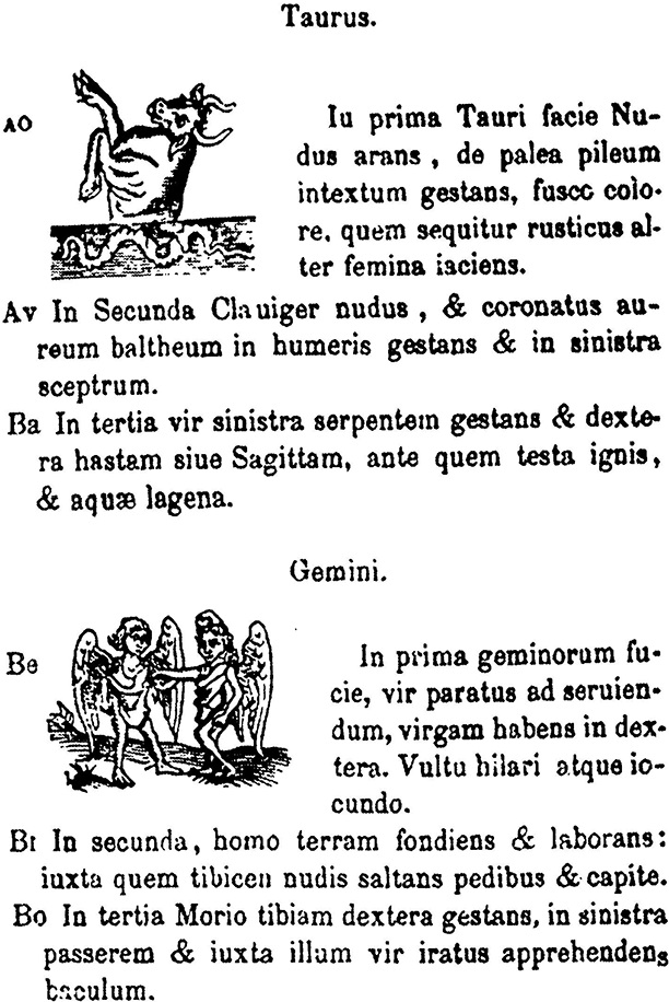 Ил. 12b. Образы деканов Тельца и Близнецов. Из книги Джордано Бруно De umbris idearum («Тени»), Неаполь, 1886
