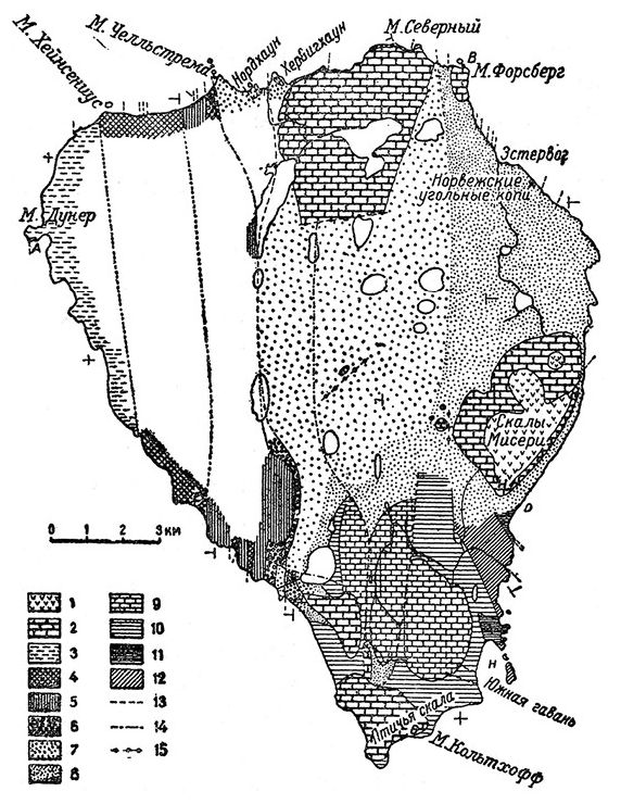 Геологическое строение Медвежьего острова. Карта составлена У. Хольтедалем на основании собственных его изысканий в 1918 г. и изысканий Ю. Г. Андерсона в 1898 г.