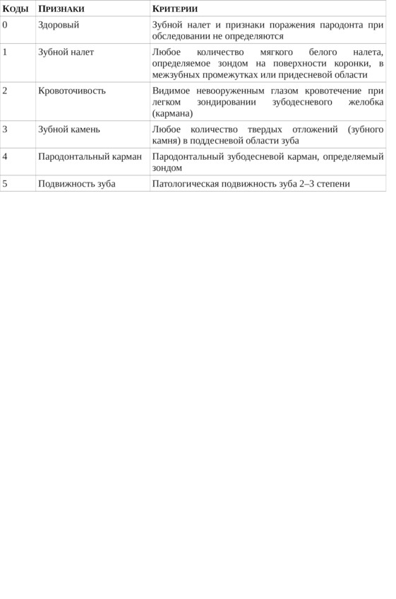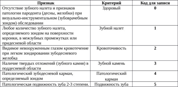 Методика определения. С помощью стандартных стоматологических инструментов выявляют зубной налёт, зубной камень, кровоточивость зубодесневого желобка, пародонтальный карман, подвижность зуба независимо от степени выраженности указанных признаков. Исследуют следующие зубы: