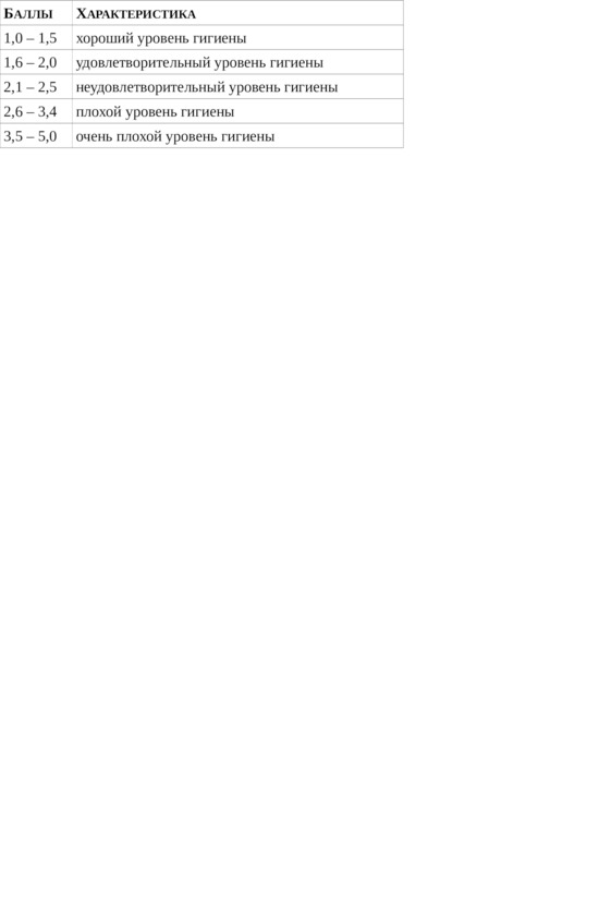 Оценка проводится нахождением средней арифметической путем сложения суммы окраски (в баллах) всех 20 (16) зубов и деления полученной суммы на количество зубов.