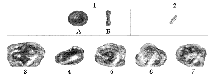 Рис. 32. Клетки крови: 1 – эритроцит: А – вид спереди, Б – вид сбоку; 2 – тромбоцит; 3 – моноцит; 4 – лимфоцит; 5 – базофил; 6 – эозинофил; 7 – нейтрофил.