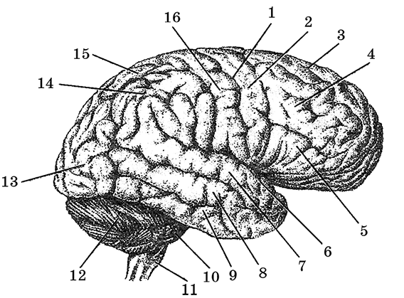 Рис. 39. Верхне-боковая поверхность больших полушарий мозга: 1 – центральная борозда; 2 – прецентральная борозда; 3 – верхняя лобная извилина; 4 – средняя лобная извилина; 5 – нижняя лобная извилина; 6 – латеральная борозда; 7 – верхняя височная извилина; 8 – средняя височная извилина; 9 – нижняя височная извилина; 10 – мост; 11 – продолговатый мозг; 12 – мозжечок; 13 – затылочная доля; 14 – нижняя теменная долька; 15 – верхняя теменная долька; 16 – подцентральная извилина.