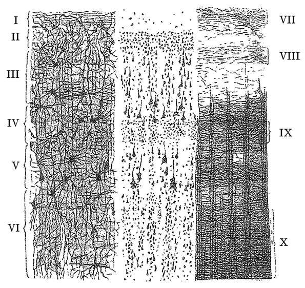 Рис. 40. Клеточные и волоконные слои коры больших полушарий головного мозга: I – молекулярная пластинка; II – наружная зернистая пластинка; III – наружная пирамидная пластинка; IV – внутренняя зернистая пластинка; V – внутренняя пирамидальная пластинка; VI – мультиморфная пластинка; VII – волокна молекулярной пластинки; VIII – волокна наружной зернистой пластинки; IX – волокна внутренней зернистой пластинки; X – волокна внутренней пирамидальной пластинки.