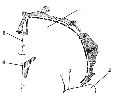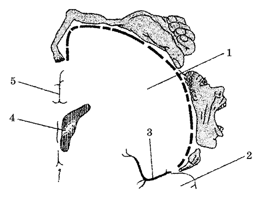 Схема разреза полушария большого мозга во фронтальной плоскости: На рисунке обозначена проекция частей тела человека на область коркового конца двигательного анализатора (предцентральной извилины): 1 – предцентральная извилина; 2 – височная доля мозга; 3 – боковая (латеральная) борозда; 4 – боковой желудочек; 5 – продольная щель головного мозга.