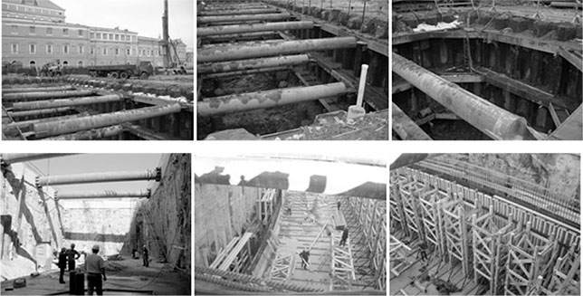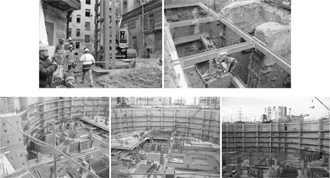 Современные западные геотехнологии ограждения котлованов адаптированы к инженерно-геологическим условиям Санкт-Петербурга. На рис. 3.6 показаны примеры устройства монолитной стены в грунте вблизи существующих зданий. «Стена в грунте» для самого большого подземного сооружения в центральной части Санкт-Петербурга на острове Новая Голландия показана на рис. 3.7.
