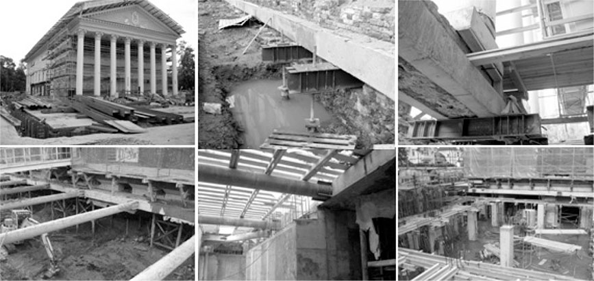 При реконструкции Каменноостровского театра (рис. 3.8) выполнялись работы по реставрации исторического здания и устройству подземного пространства глубиной 6,5 м. Эта работа уникальна для мировой геотехнической практики (реставрационный вариант технологии top-down, когда вверх идет реставрация, а вниз – подземное строительство).