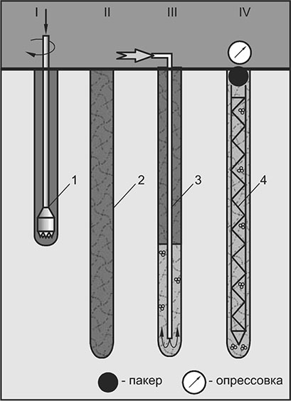 I – бурение скважины шарошечным долотом с промывкой бентонитовым раствором;