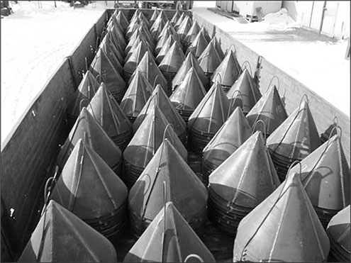 ♦ вывешивание трубно-арматурного каркаса над кондуктором арматурной частью вниз, вертикальное центрирование и монтаж трубно-арматурного каркаса в скважине с компенсацией эксцентриситета и фиксацией зазоров от стенок и дна скважины с помощью кондуктора;