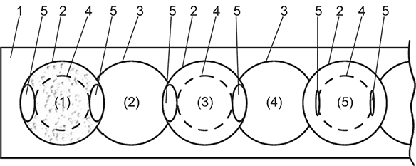 Рис. 3.14. Бурение четных скважин с использованием образованных в нечетных сваях пазов в качестве направляющих, их армирование и бетонирование в них четных свай. Форшахта 1 с направляющими отверстиями для нечетных 2 и четных 3 скважин, каркасы арматуры 4, гибкие армированные рукава 5