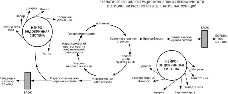 Ф. Александер (2022) описал вегетоневроз, симптомы которого являются физиологическим сопровождением определенных эмоциональных состояний. При отсутствии направленного вовне действия, сбрасывающего напряжение, функциональные расстройства переходят в необратимые изменения органов. Причиной блокады действий являются ситуации, в которых актуализируются специфические конфликты раннего детства.