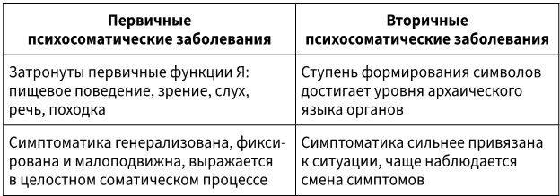 Г. Аммон (2000) разделил психосоматические заболевания на две группы: первичные и вторичные (табл. 4). Он указал на защитный характер психосоматического процесса, который помогает пациентам либо избежать сознания тяжелейших жизненных проблем, либо отгородиться от разрушительного поведения объектных фигур при помощи болезни. Вместо вопроса «Кто я?», связанного с экзистенциальной тревогой, такой человек постоянно ищет ответ на вопрос «Что со мной?». Таким образом, вопрос о собственной идентичности подменяется вопросом о симптоме.