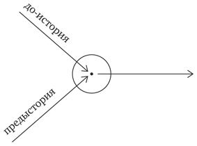Анализ шел на примере материала и функции… Мы можем взять материал и организующую его форму или структуру. Это ничего не меняет. Есть момент происхождения сложного искусственно-естественного образования, затем есть, соответственно, линии до-истории и предыстории, где, скажем, в до-истории, существуют чистые до-организационные формы – сами по себе и на другом материале, а предыстория – этот материал как таковой (см. рис. 9а). Происходит сложное возникновение, или происхождение, где функции материала, организационная форма материала и материал соединяются. Но тогда это означает, что здесь где-то происходит соединение, по сути дела, двух процессов, которые опять потом могут разойтись, потом опять могут соединиться, а в стык этих процессов могут приходить какие-то другие, дополнительные образования (см. рис. 9б).