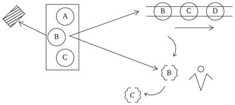 Итак, что же происходит? Представьте себе, что перед нами, перед наблюдателем, вот так работает этот механизм. Внешне он выглядит как переброс от А к В, от В к С и т. д. И поэтому в ответ на вопрос о том, что здесь происходит, мы говорим: ясно, что у нас, на нашем табло сознания, последовательно высвечивается сначала А, потом появляется В, потом появляется С, и у нас идет процесс трансформации одного в другое. Но нет никаких процессов. Я фактически задаю такую модель, которая для наблюдателя как бы имитирует процесс, а на самом деле никаких процессов не имеет начисто. Ведь я же ее так устроил. При этом весь механизм делает следующее: он с одного экрана нечто забирает, отражает на себя, перебрасывает на другой экран, после этого стирает образ или отправляет его в долговременную память.